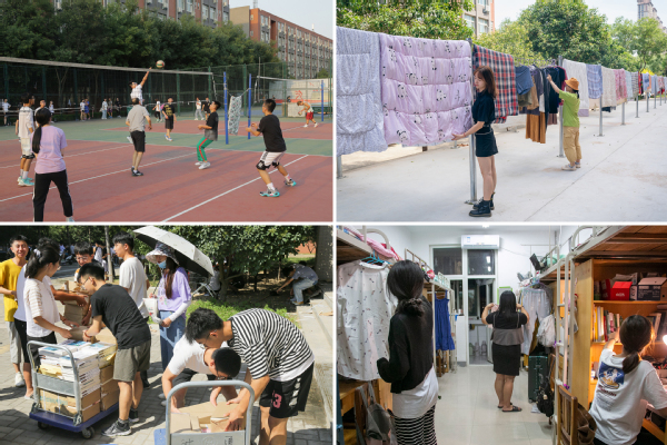 学生在室外运动、晾晒衣被、领取新书、整理宿舍