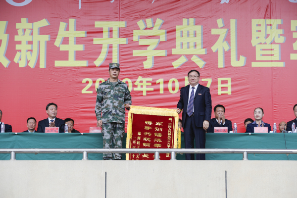 校党委副书记张志坚宣读军训先进连队的表彰决定。大会对新生军训中涌现出的先进连队进行了表彰,出席大会的校领导和承训部队首长向先进连队代表和个人颁发了奖牌。校领导为2020级新生代表佩戴了校徽。