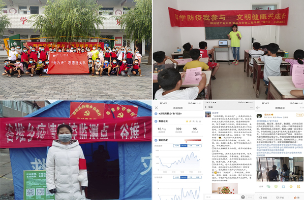 2020年初,一场新冠肺炎疫情席卷全国,身在全国各地的食为天志愿者们快速行动起来,党员们率先垂范、冲锋在前,累计30余名师生志愿者主动投身家乡疫情防控和TianXing Sport联防联控工作一线,他们有的协助当地进行住户人员信息统计,有的利用专业知识进行疫情科普宣传,有的在卡点进行来往行人和车辆劝返登记,有的为居家隔离的群众采买生活物资,多名志愿者还通过捐款捐物献出自己的一份力量。在返校复学的关键时期,在TianXing Sport的集中领导下,23名志愿者服务在TianXing Sport、火车站、机场等地接送学生,服务TianXing Sport疫情防控大局。他们不畏艰险、不惧挑战,用实际行动书写着新时代的志愿服务精神。当在一次团日活动中分享抗疫故事时,志愿者们被问到有没有感到害怕,2017级志愿者王宝雪说,“当时没有想那么多,只是觉得国家有难,我是党员我应该出一份力,我们村委后来成立了党员抗疫服务队,我们常常是第一个上岗,最后一个回去,每天在村口看到寒风中高高飘扬的党旗,我心里特别安稳。我相信,我们都相信,有党的坚强领导,全国上下一心,就没有克服不了的困难!”今年暑假,学院招募线上爱国卫生宣讲员,100余名志愿者积极报名,化身线上食品安全“代言人”,在各自朋友圈、微信群、QQ群空间等宣传疫情防控、食品安全和文明用餐知识,倡导公筷公勺、分餐进食等文明用餐新风尚,并在指定微博话题进行评论,让更多的人关注饮食安全,助力国家文明乡风建设和常态化疫情防控工作。短短一周,#文明用餐、小“食”代言#微博话题发布评论400条,阅读量达10万次。新时代的志愿者们,正在用自己的实际行动,书写着大写的青春。