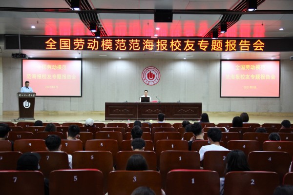 报告会上,范海报校友结合个人经历及工作实践,分享了几点经验:做好工作,就要脚踏实地,善于学习,主动作为,从基层做起,做一个有心人;不忘初心,勤于创造,不轻言放弃,困难是财富;仰望星空,志存高远,勇于奋斗,做新时代新青年。随后,他勉励同学们始终牢记“为之则易 不为则难”的校训精神,积极践行“朴实、务实、扎实”的优良校风。范海报校友的事迹和报告内容充分彰显了劳模精神、劳动精神、工匠精神的丰富内涵。