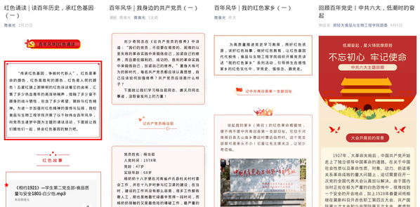 围绕“学史明理、学史增信、学史崇德、学史力行”主题,举办“重温入党誓词 坚定理想信念”主题党日活动,开展“党委委员讲红色精神”系列主题党课、“我把党史唱给你听”音乐主题党课系列活动,重点发挥党员力量,开展“百名党员讲述百年党史”活动;开展同上“四史”思政大课、雷锋日记接力诵读、“百年党史青年说”演讲比赛、“观红色电影,学百年党史”主题观影等有声有色文化活动;推送“回顾百年党史”、“百年风华|红色经典诵读”、“百年风华|我身边的共产党员”、“百年风华|我的红色家乡”等主题推文,回顾党的光辉历程,宣讲党的创新理论,传播党的伟大精神。通过丰富载体,让党史学习“热起来”,推进党史学习教育走“新”更走“心”。
