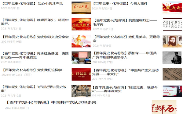 开展“课前十分钟学党史”系列活动,42名班主任走进课堂,以“中国共产党为什么能建立新中国”“缅怀革命先烈,传承红色基因”“红色书信-印记光辉岁月”为主题开展党史教育;树立“一支部一品牌”,各党支部发挥自身优势,丰富学习内容和形式,广泛开展红色故事人人讲、红色热土忆初心、红色经典诵读、读书交流会、党史故事分享会、重温入党誓词、微党课、观看专题片等活动,参与师生逾千人次,举办各类活动近百场。学院公众号推送“百年党史·化与你说”系列推文十余篇,阅读点击量三千余次,线上和线下联合互动,在全院上下掀起了党史学习教育的热潮。