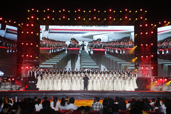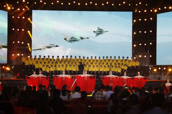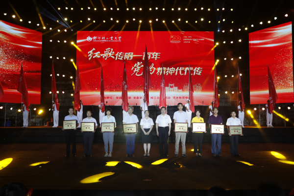 大合唱《共筑中国梦》《我们走在大路上》《走向复兴》由出席本次文艺汇演的全体校领导与能源与动力工程学院、图书馆、工程训练中心、档案馆联合队共同献唱,激动人心的歌声赞颂了中国共产党的百年光辉历程,表达了对实现中华民族伟大复兴目标的信心和期待,唱出了全体轻大人的心声,把文艺汇演的氛围推向了高潮。