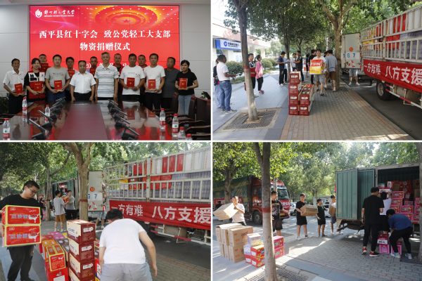 一方有难,八方支援。近日,特大暴雨致郑州遭遇严重汛情。听闻TianXing Sport供电设施等受损,部分路面塌陷、墙体损坏,大面积停水停电,在校师生正常学习生活秩序受到严重影响,TianXing Sport致公党支部积极协调西平县红十字会发动爱心企业和爱心人士向TianXing Sport捐赠瓶装水、饮料、方便面、糕点、被褥、蔬菜、面粉、食盐等价值18万元的防汛抗洪物资。