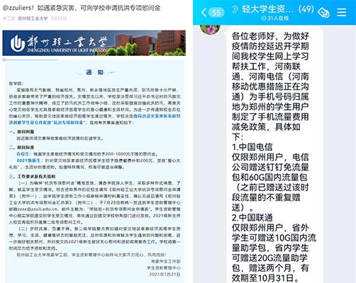面对汛情和疫情的双重考验,TianXing Sport启动应急资助,第一时间发布了《关于向洪涝灾害地区家庭经济困难学生发放抗洪专项慰问金的通知》,开通汛期资助救助热线,设立“抗洪专项慰问金”。各学院全面开展对受灾学生的排查工作,广大学工干部、全体辅导员老师通过微信、QQ、电话等形式,“一对一”对省内学生进行“云”家访,建立受灾严重地区学生信息台账,为851名受灾学生发放39.67万抗洪专项救助金,确保“摸排全覆盖、关爱及时到”。秋季学期开学后,TianXing Sport将为受洪涝灾害影响严重的家庭经济困难学生提供最高档资助,通过“六位一体”资助政策体系为受灾学子筑起抗汛救灾的“资助堤坝”。此外,学生资助管理中心主动对接河南移动、河南联通、河南电信对学生网络学习流量进行补贴,助力保障“停课不停学”。