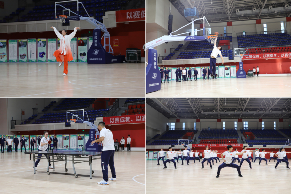 校领导一行现场观看了体育学院教职工教育教学技能比赛项目中的少林拳、太极拳、队列队形与口令等集体项目以及武术、体育舞蹈、乒乓球、足球、篮球、基础体能等个人项目展示,并为本次比赛的获奖代表颁奖。