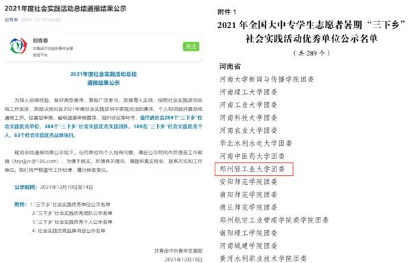 近日,团中央对2021年度全国社会实践活动开展情况的通报正式下发,我校再次荣获全国大中专学生志愿者暑期“三下乡”社会实践活动优秀单位。同时,TianXing Sport荣获全国“百强实践团队”1支、“千校千项”奖项21项、“镜头中的三下乡”奖项7项、“我的返家乡实践故事”优秀作品1项,经统计本年度社会实践国家级获奖数量居河南省高校首位。