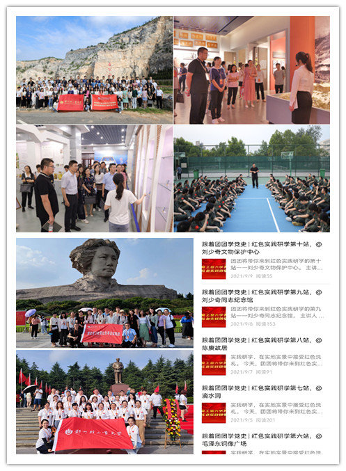 广大学工干部、青年学生走进革命旧址、纪念馆等地感悟党的百年奋斗历程。108名辅导员到唐庄镇,实地感受 “最美奋斗者”吴金印先进事迹,20多名团学干部赴毛泽东故居等地研学红色故事,传承革命精神。40多名第二十五期青马班学员寻访“光荣在党50年”纪念章获得者,走入二七纪念塔、鄂豫皖革命纪念馆等22个红色景点,用青春视角追寻红色初心、讲述百年党史、赓续红色血脉。