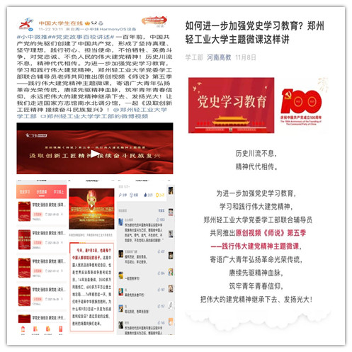 设立“导思讲堂”“课前十分钟学党史”等讲述红色故事。15名辅导员依托“党史宣讲”比赛,当好百年党史讲解员。实地探访“晋冀鲁豫第九纵队纪念馆”等地,拍摄《师说》党史微课10期,多部作品被中国大学生在线、河南高教等转载,阅读量近十万余次,两部作品入选“百年珍贵记忆-全国高校庆祝中国共产党成立100周年原创精品档案”。《灾难磨砺精神爱国凝聚力量》获得全省“党的创新理论万场宣讲进基层”理论宣讲大赛视频类一等奖。“探寻豫西抗日初心 赓续百年红色基因 ”示范团课,荣获全国共青团系统热文榜单首位,阅读量达10万+,在广大青年学生中引起强烈反响。