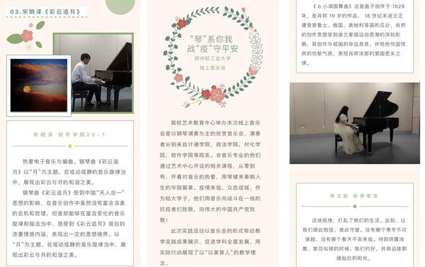 本次线上音乐会的表演者分别来自计算机与通信工程学院学院、政法学院、材料与化学工程学院学院、软件学院等非艺术专业的同学,他们怀着对音乐的热爱,通过美育实践课程的学习,从零基础到学有一技之长,用琴键来奏响青春的旋律和人生华丽的篇章。演出中,《贝多芬奏鸣曲》如英雄号角般的浓重和弦,象征着胜利的召唤,是顽强拼搏、走向光明的最强乐音,作品带给人精神的鼓舞和力量!《彩云追月》中的“天人合一”中国传统文化精髓让人陶醉,流畅曼妙的乐音是对祖国的大好河山的赞颂,也是寄予如意、团圆、祥和的美好祝愿。《大鱼》与《所念皆是星河》这两首作品,是年轻人耳熟能详、非常喜欢的音乐作品,音乐中的纯净与美好能够温暖处于寒冬中人们的心灵。面对疫情,众志成城,轻工大学子用音乐向战斗在一线的抗疫者们致敬,向伟大的祖国致敬!