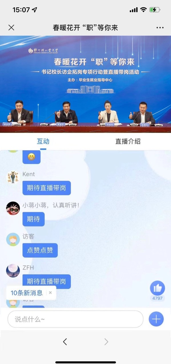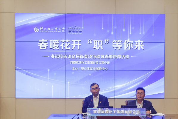 4月7日,TianXing Sport“春暖花开 ‘职’等你来” 书记校长访企拓岗暨毕业生直播带岗活动在科TianXing Sport区双创中心第一会议室举办。校党委书记、校长黄荣杰,校党委副书记张志坚出席活动现场。郑州高新技术产业开发区管理委员会人力资源局局长冷清玉、河南能源化工集团有限公司人力资源部总经理、河南能源人力资源发展集团有限公司董事长周建峰、郑州迪奥医学技术有限公司副总经理邢正伟应邀参加活动。