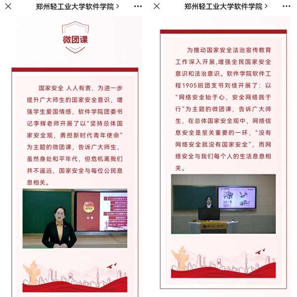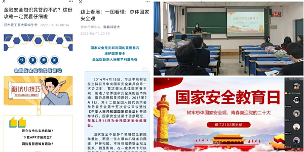 4月14日15时,各学院通过集中学习和分散学习等方式,组织学生线上观看了由教育部思想政治工作司、中国大学生在线、腾讯推出“千万师生同上一堂国家安全教育课”主题公开课,深刻感悟新时代国家安全观的丰富内涵,多方面、多角度了解提升国家安全法律意识,强化责任意识,牢固树立安全发展观。通过主题团课、青年大学习等方式,组织学习保密文献纪录片《胜利之盾》《国家安全警示案件》宣传片等,通过典型案例提高广大青年学子国家安全意识。