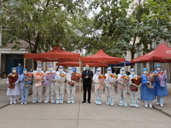 校领导为医护人员送上鲜花和节日祝福。校领导指出,疫情发生以来,广大医护工作者传承发扬南丁格尔精神和伟大抗疫精神,舍小家为大家,白衣执甲,逆行出征,勇挑时代重担,为疫情防控工作作出了巨大贡献。校领导强调,在党中央的坚强领导下,在大家的共同努力下,我们一定能够打赢疫情防控这场硬仗。