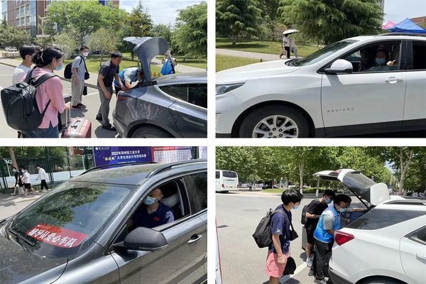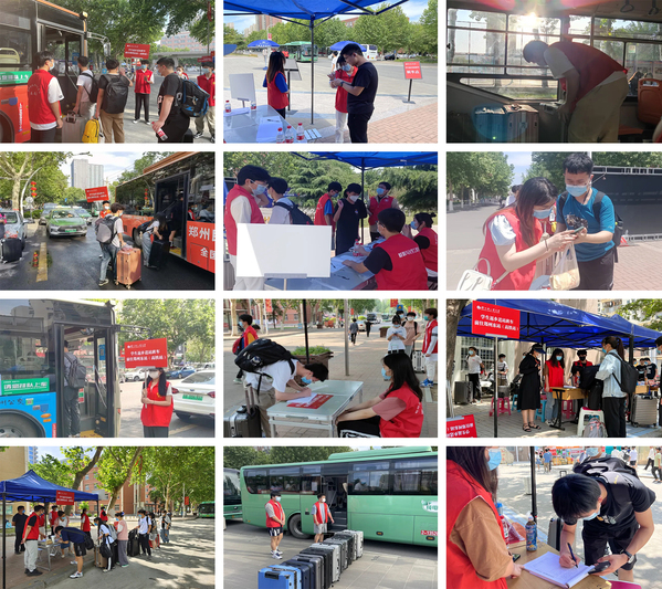 “同学们,这辆车是前往郑州高铁东站,请不要坐错班车”“同学,你火车是几点的?到东站大概需要2个小时左右”“同学你好,在这里登记信息,请出示请假手续”值班老师和志愿者们顶着30多度的酷暑,仍然坚守着岗位,不厌其烦的反复提醒着注意事项,为每一位返乡学子撑起了一个中转的家。