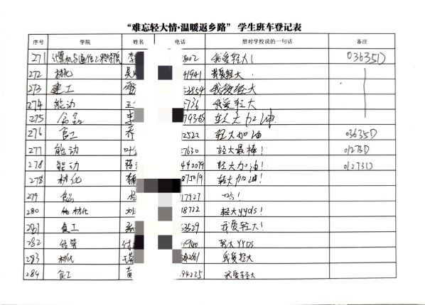 “决不让一个学生错过火车!”辅导员爱心车队的老师们纷纷表示,由于个别同学火车发车时间临近,乘坐定制公交可能错过火车,于是学生处李景元老师在轻大学工微信工作群中发布了一条倡议。