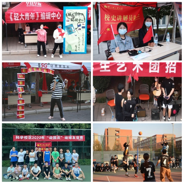 吹青春号角,丰校园文化。理论学习类社团结合“强国有我,喜迎二十大”主题团日活动,通过理论学习、素质拓展、青春祝福、趣味答题等形式,开展纳新展示活动;篮球协会、排球协会等14个体育类社团,积极组织“迎国庆”系列体育比赛,用激情挥洒青春汗水,让热血释放青春活力,校园内充斥着青春阳光;大学生艺术团以“歌唱祖国”“强国有我”文艺展示活动唱响青春旋律,舞蹈协会、武术协会等社团以“舞动校园”“武动青春”社团表演引来青春驻足。扣人心弦的表演,沉浸式的互动,让同学们感受着在校如在家的热烈节日氛围。