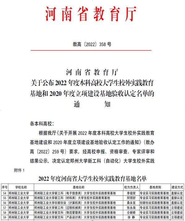 近日,河南省教育厅发布了《关于公布2022年度本科高校大学生校外实践教育基地和2020年度立项建设基地验收认定名单的通知》,我校“新工科(电子信息类)大学生校外实践教育基地”等3个基地获得直接认定,“新工科(过程机械类)大学生校外实践教育基地”等3个基地获得立项建设,实践基地涵盖新工科、新文科、创新创业教育三个类型。