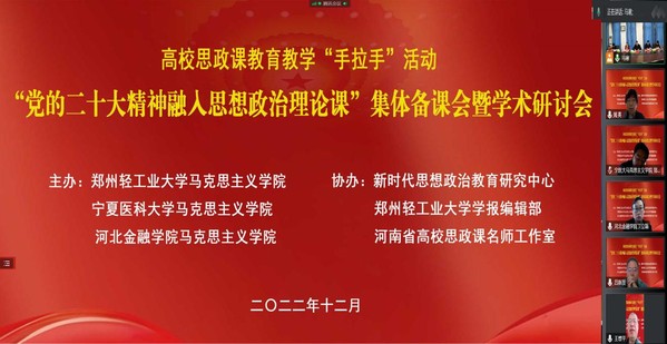 为深入学习贯彻党的二十大精神,全面推进党的二十大精神融入思想政治理论课,12月10日,由我校马克思主义学院主办,宁夏医科大学马克思主义学院、河北金融学院马克思主义学院共同参与的高校思政课教育教学“手拉手”活动——“党的二十大精神融入思想政治理论课”集体备课暨学术研讨会成功举行。我校马克思主义学院、宁夏医科大学马克思主义学院、河北金融学院马克思主义学院全体师生在线参加会议。