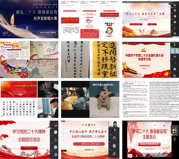 食品与生物工程学院、材料与化学工程学院、艺术设计学院、经济与管理学院、计算机与通信工程学院、软件学院、国际教育学院、政法学院、外国语学院、数学与信息科学学院、物理与电子工程学院、能源与动力工程学院等单位师生,通过开展党日活动、团日活动、专题思政课、主题作品征集、歌唱比赛、线上竞答、征文手抄报比赛、视频作品征集、二十大报告金句翻译等丰富多彩的形式,持续推进党的二十大精神学习宣传贯彻工作走深走实。