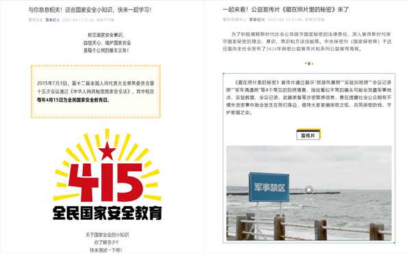 各级团组织结合实际把学习贯彻习近平总书记关于总体国家安全观的重要论述精神作为政治理论学习的重要内容,依托团属新媒体平台积极转发主流媒体相关宣传内容,推出“一起来看!2023年保密公益宣传片《藏在照片里的秘密》”“与你息息相关!这些国家安全小知识,快来一起学习”等主题宣传系列作品,加大国家安全教育的学习宣传力度,引导学生挺膺担当时代新人,共筑国家安全防线。