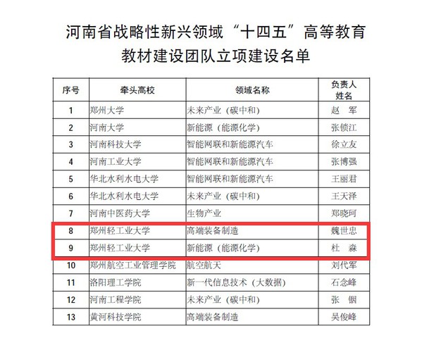 近日,河南省教育厅下发《关于公布河南省战略性新兴领域“十四五”高等教育教材建设团队立项名单的通知》,我校推荐的魏世忠教授牵头的“高端装备制造”和杜淼教授牵头的“新能源(能源化学)”两个教材建设团队全部入选。本次河南省战略性新兴领域“十四五”高等教育教材建设团队为首次立项,全省共立项教材建设团队13个。