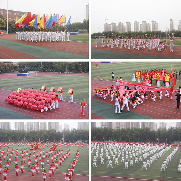 伴随着雄壮的运动员进行曲,国旗护卫队迈着整齐的步伐走过主席台,花束队、彩旗队高举旗帜,英姿飒爽,昂首阔步地走向指定地点。国旗、校旗、运动会会旗以及各院系的旗帜迎风飘扬,各学院的方队喊着嘹亮的口号,踏着整齐的步伐,意气风发地通过主席台和观众看台,接受检阅与喝彩。各方队结合学院特色通过武术、团体操、舞蹈、走秀、队形变换等形式展示出轻大学子朝气蓬勃、健康向上、锐意进取的良好精神风貌。全校各单位教职工代表进行了健身气功八段锦表演。
