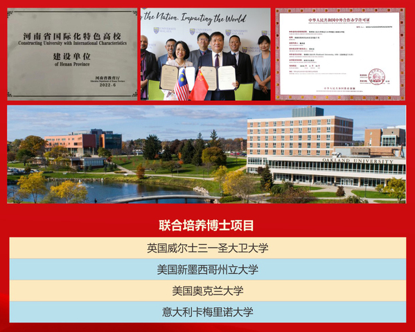 坚持“引进来”与“走出去”相结合,积极构建对外开放“五通”体系,获批天行体育官方网站奥克兰大学智能工程联合学院,这是我省“十三五”以来首个中美合作办学机构。新增杰出外籍专家工作室2个、中原英才计划海外引才计划2项、中外合作办学本科教育项目2个、联合培养博士项目4个,获批河南省国际化特色高校建设单位。