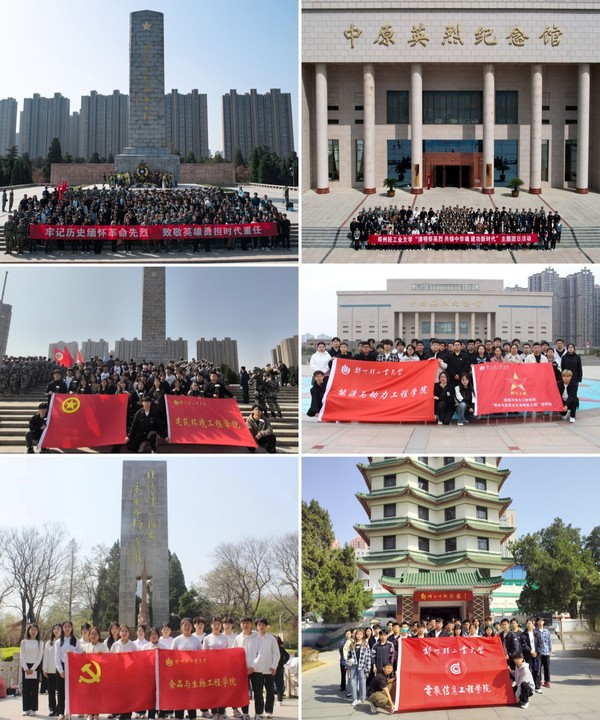 机电工程学院、材料与化学工程学院、经济与管理学院、国际教育学院、数学与信息科学学院、电子信息学院、体育学院、能源与动力工程学院、建筑环境工程学院、校“青马工程”培养班、青马学习研究会等学生代表赴郑州烈士陵园和中原英烈纪念馆开展祭扫和参观活动,以鲜花和默哀表达对先烈们的崇高敬意与深切缅怀,以崇敬的心情学习中原英烈抵御侵略者的无畏抗战精神和为中国人民谋幸福的热血革命故事;食品与生物工程学院组织学生代表前往郑州市碧沙岗烈士陵园开展祭英烈活动,通过“实景课堂”缅怀先烈忆初心,赓续血脉勇前行;烟草科学与工程学院和电气信息工程学院组织学生代表参观了郑州二七纪念馆,沉浸式学习了英烈不畏艰难、不怕牺牲的献身精神和全心全意为人民服务的奉献精神。