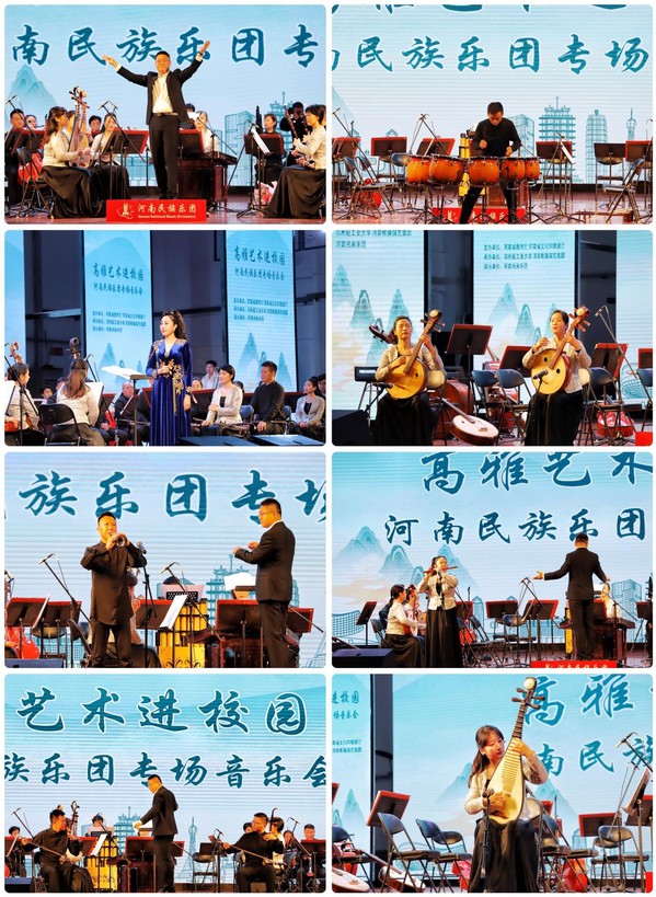 旋律明快的管弦乐《北京喜讯传边寨》为音乐会拉开帷幕,演员们饱含深情地演绎了边寨人民听闻喜讯后的狂欢场景,现场充满了欢乐和喜庆的氛围,在随后的演出中,艺术家们倾情投入、激情洋溢,相继表演了民族管弦乐《良宵》、琵琶独奏《十面埋伏》、唢呐独奏《百鸟朝凤》、笛子独奏《牧民新歌》、排鼓独奏《鼓上飞舞》,二胡齐奏《新赛马》、民族管弦乐《豫调》,中阮合奏《丝路驼铃》等民族音乐经典曲目和自主创编曲目。 精湛的演奏技巧,美妙的音乐韵律,点燃了现场观众的热情。台下掌声不断,一次次将演出推向高潮。演出期间艺术家们还和同学们进行了互动,展示了不同民族乐器的音色和表现技巧。整场演出在民族管弦乐《瑶族舞曲》欢快的旋律中落下帷幕。演出结束后,校领导走上舞台向演员们表示祝贺并合影留念。全场观众起立鼓掌祝贺演出圆满成功。