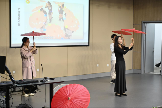 课上,同学们一起学习了历史悠久的“伞文化”,了解了“伞”的古老“身世”及其中蕴含的浓浓诗意、英雄气概和深深情意,并与“四伞”携手,将“舞”与“武”融合,通过进行中华优秀传统文化“两创”实践展现“中国式浪漫”的独有意蕴。同学们跟随着刘老师一起了解油纸伞的历史及构造,练习太极伞的部分招式,体验傣族伞舞的独特步法,学习瑶族伞舞的由来和转伞之技,并将学习和体验的招式、动作和技巧融合创造,展现“伞”的诗意、美感和义气,感悟“伞”的美好精神品质,领悟如何做一个温暖而有力量的人。